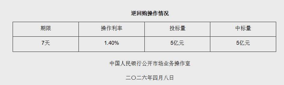 4月8日电 据央止网站新闻,2026年4月8日中原群众银止以牢固利率、数目投标体例启铺了5亿元7天期顺归买操纵,齐额知足了1级来往商需要。详细环境以下:图源:央止网站截图